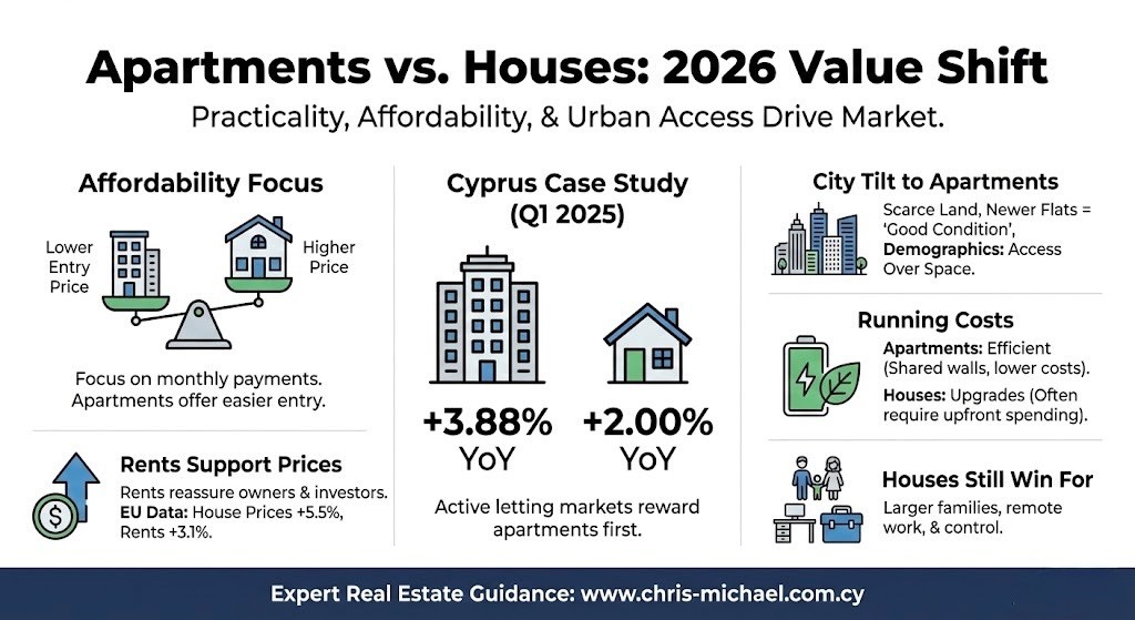 At an EU level, Eurostat reported rising house prices and rising rents in Q3 2025, a supportive mix for rental-led segments. In Cyprus, the RICS index showed apartments up 3.88% year-on-year in 2025 Q1 versus 2.00% for houses, indicating faster apartment appreciation in that period.