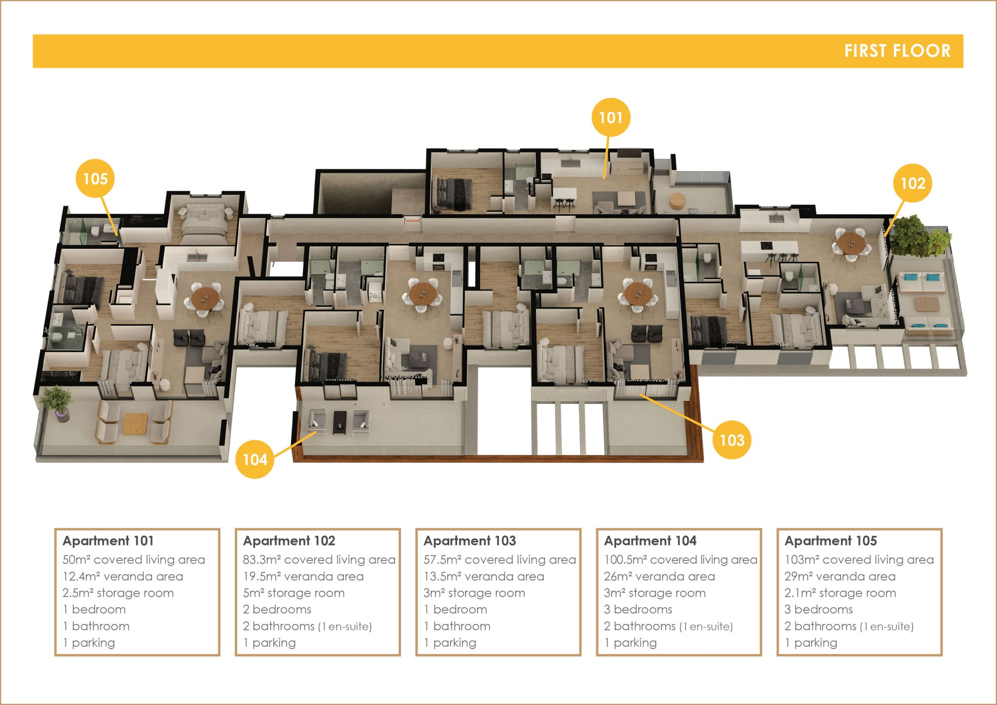 This modern project is located in Oroklini, Larnaca, just minutes from the sea and conveniently close to the city. Inside, apartments feature clean lines, natural materials, and floor-to-ceiling glass. The complex offers premium amenities including a gym, a communal swimming pool, a lounge, and a BBQ area.