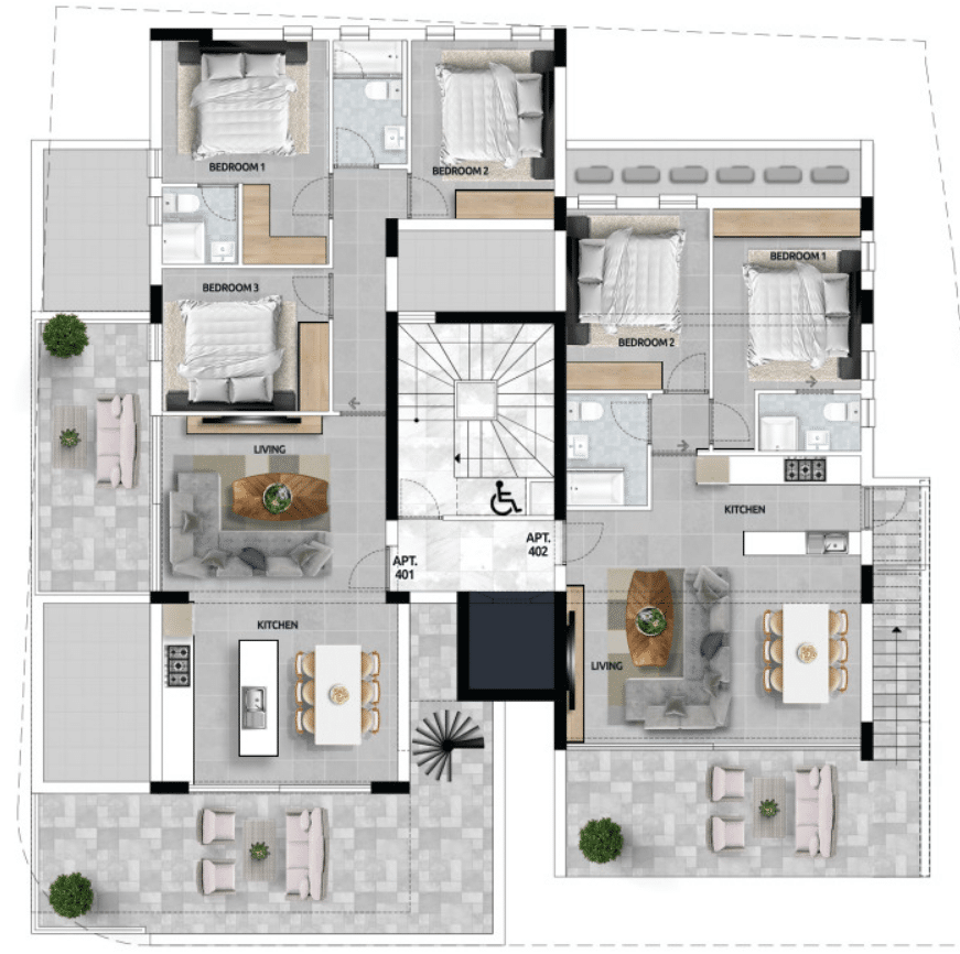 The new project in the Marina area of Larnaca features a total of 11 units: three one-bedroom apartments on the 1st, 2nd, and 3rd floors; six two-bedroom apartments on the 1st, 2nd, and 3rd floors; one two-bedroom penthouse on the 4th floor; and one three-bedroom penthouse on the 4th floor, both with private roof gardens. The three-bedroom penthouse also includes a private pool.