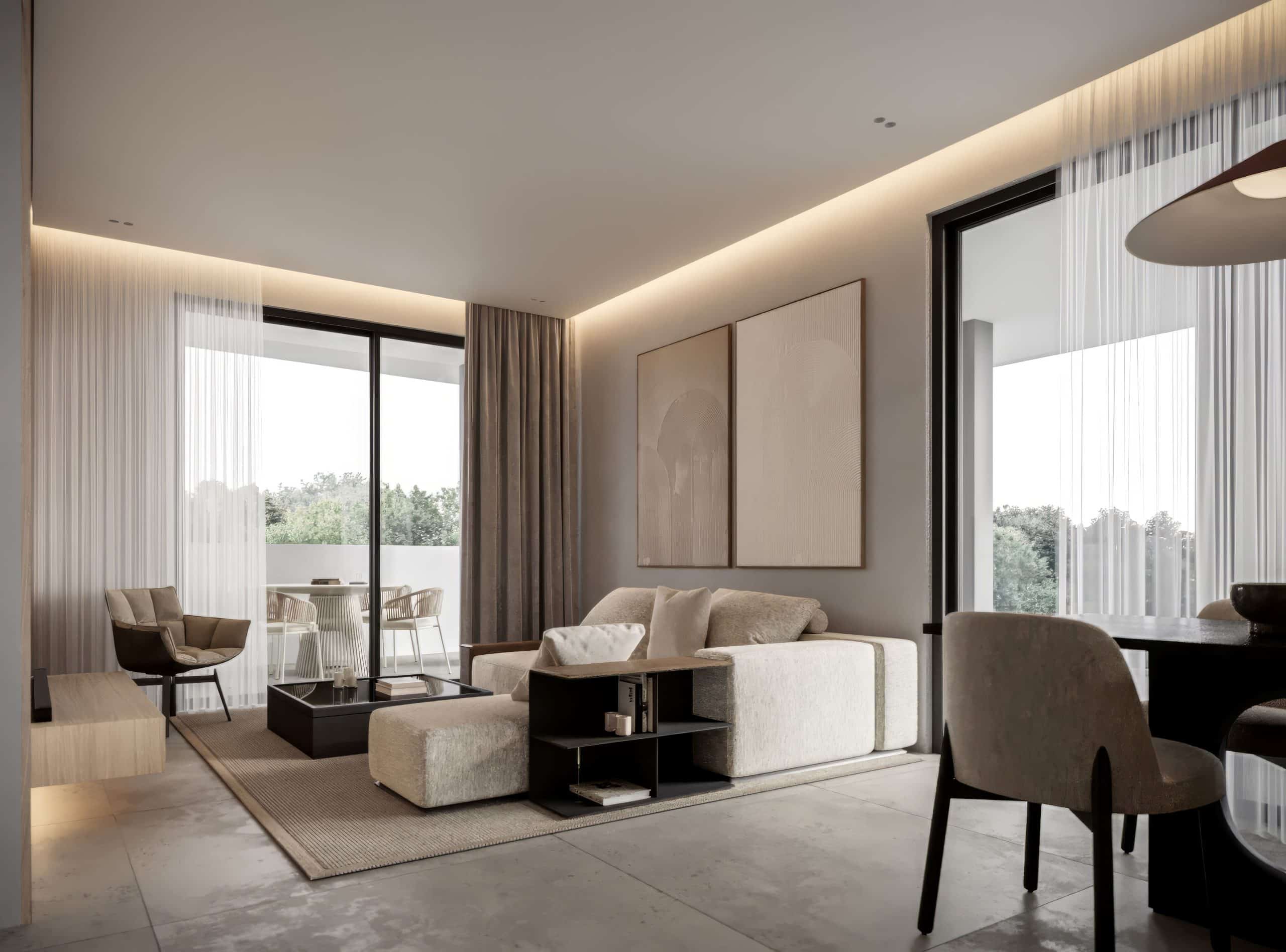 The apartments are designed with an open-plan layout that seamlessly connects the kitchen, dining, and lounge areas. Full-length glass doors open onto the expansive verandas, enhancing the airy and inviting ambiance. Natural light fills the living spaces, and the master bedroom comes with a luxurious en-suite bathroom and access to the veranda.