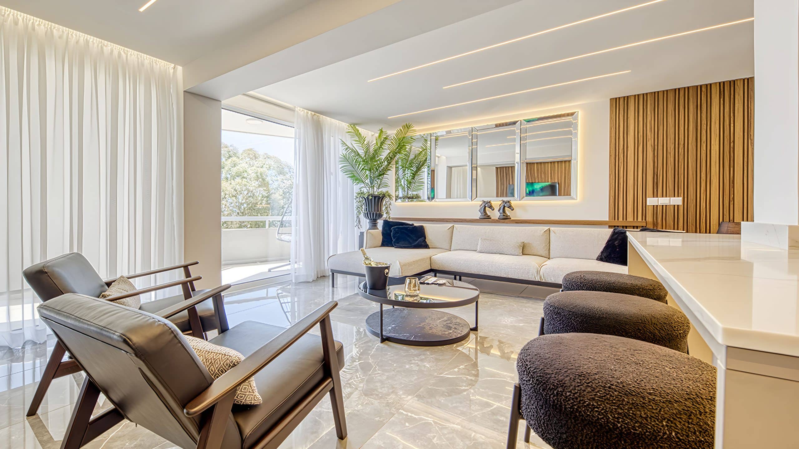 The apartment features two spacious master bedrooms and an elegant open-plan living area. Floor-to-ceiling glass doors open onto a large private balcony. Furnished and decorated to the highest standards, the apartment is equipped with premium electrical appliances.
