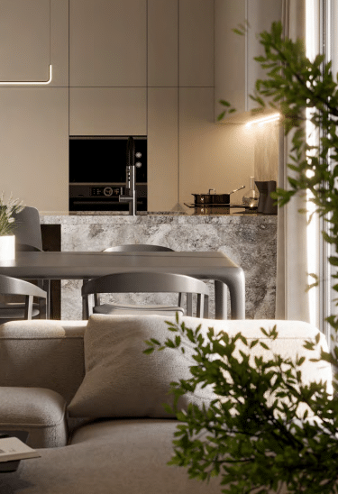 The interior design draws inspiration from the richness of luxurious natural materials and textures. With these elements in mind, each apartment has been thoughtfully designed to strike a perfect balance between these elements. As a result – harmonious and unified spaces that seamlessly blend functionality with aesthetics.