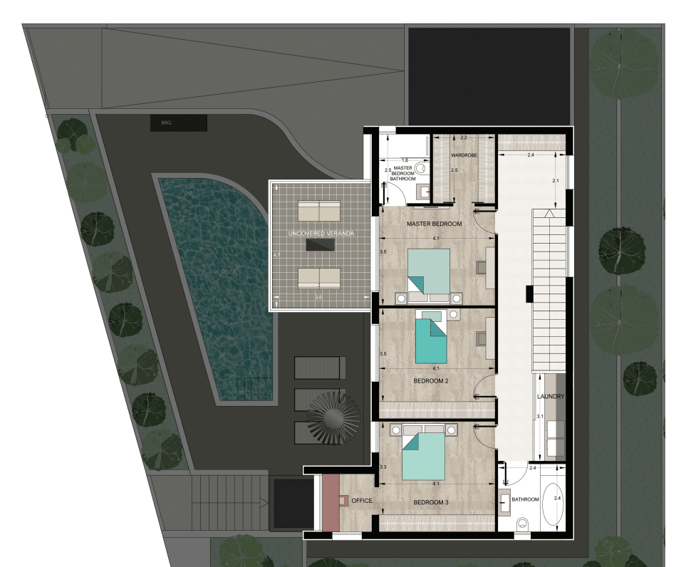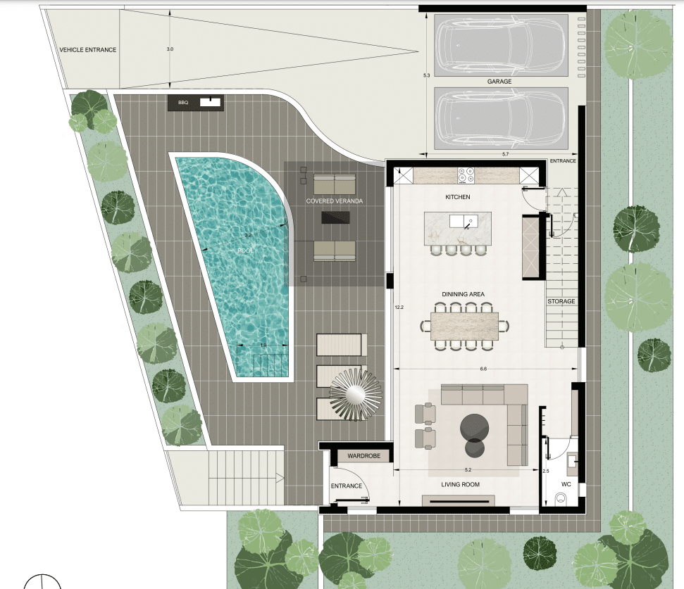 The villa consist an open-plan kitchen and living area with expansive windows that fill the space with natural light and offer views of the serene surroundings. It has 3 spacious bedrooms, 2 modern bathrooms, and a guest toilet. Additionally, the property is equipped with a smart home system for modern convenience. Outside, you’ll find a private swimming pool.