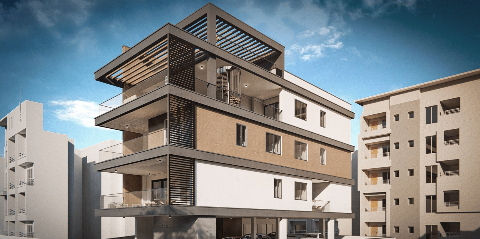 The unique residential building in the vibrant Polemidia area in Limassol. With its distinctive wooden facade, building exudes warmth and elegance, blending harmoniously with the surrounding natural environment.