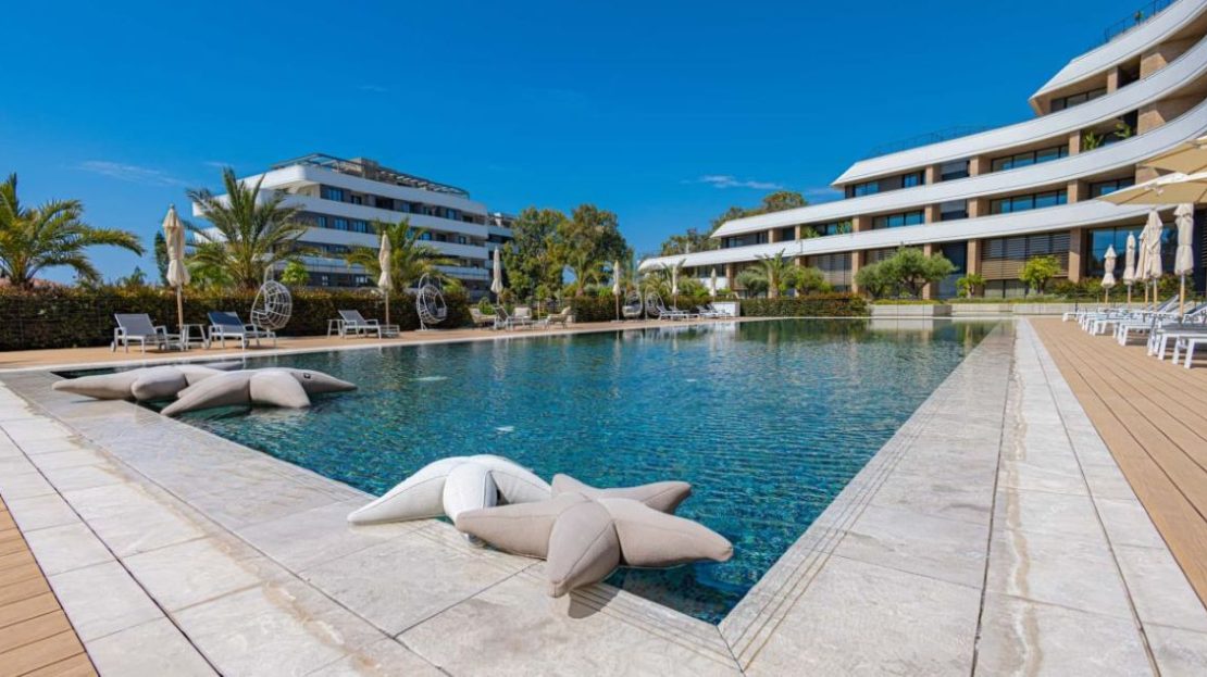 Arranged around a central landscaped garden, the architectural design draws inspiration from both natural and man-made elements. Resembling a superyacht, each block gracefully slopes down from its highest point, adorned with balconies on all sides. Continuous balustrades, forming wide horizontal bands, wrap around the blocks at each level, accentuating the development’s expansive and horizontally oriented layout, spanning over 300 linear meters.
