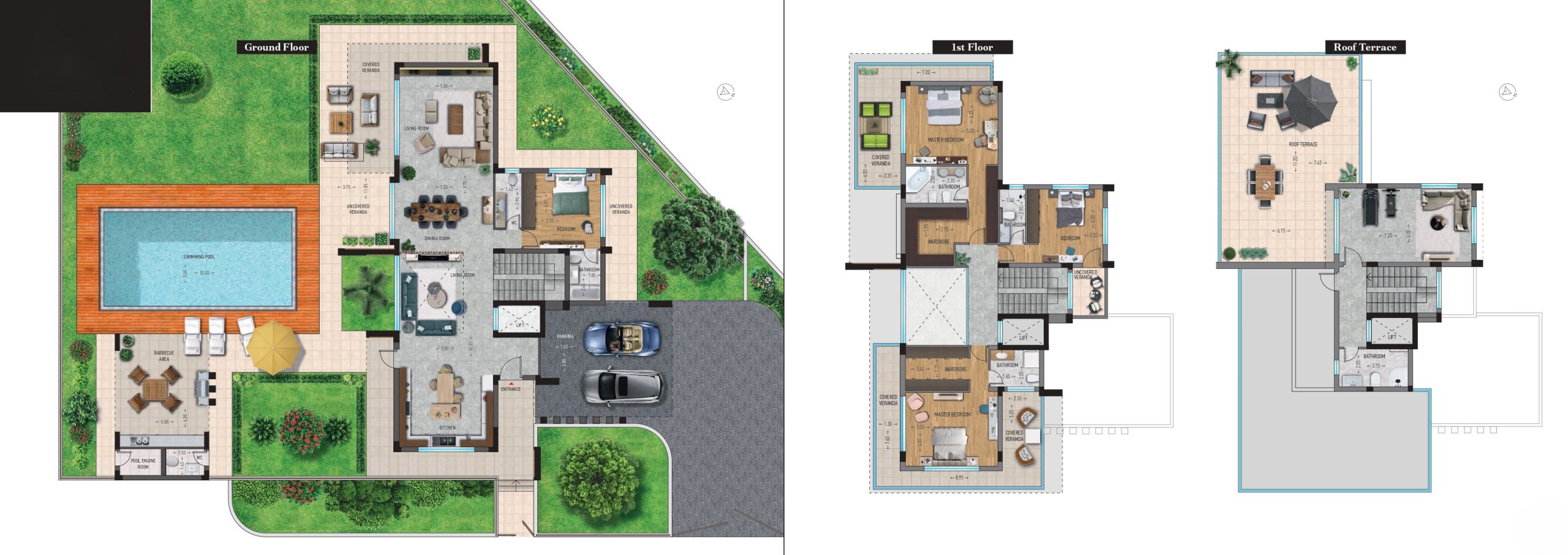 Both villas include private parking, private green gardens, swimming pool, elevators, outside sitting area and large balconies. The homes are gated, secured and surrounded by tranquil nature providing a vibrant feel of sublime relaxation.