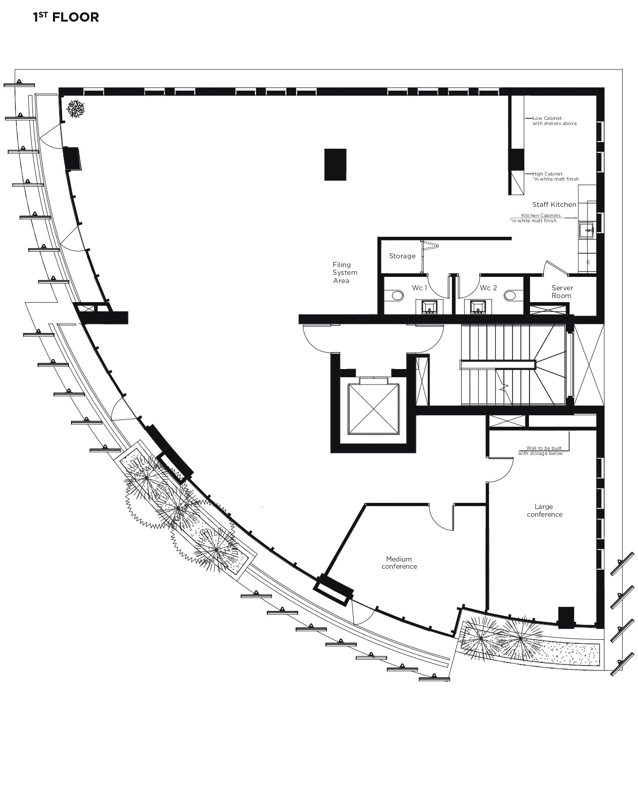 It includes a large conference room, a medium-sized conference room, an open-plan office area, a kitchen, storage space, two WCs, and a server room. The building also features a reception area and a café in the lobby.