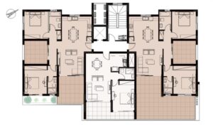 The apartments have been designed to offer large rooms with natural light. The living room with open plan kitchen has large patio windows; all apartments include at least one bedroom with a large wardrobe and a private bathroom.