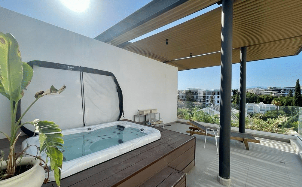 This penthouse located in a prestigious and quiet residential location Agios Nicolaos in the center of the city, with easy access to the highway and 1 km from the sea. It consists of 2 bedrooms, 2 bathrooms, a living area combined with the kitchen, a spacious veranda, and a roof garden with jacuzzi.