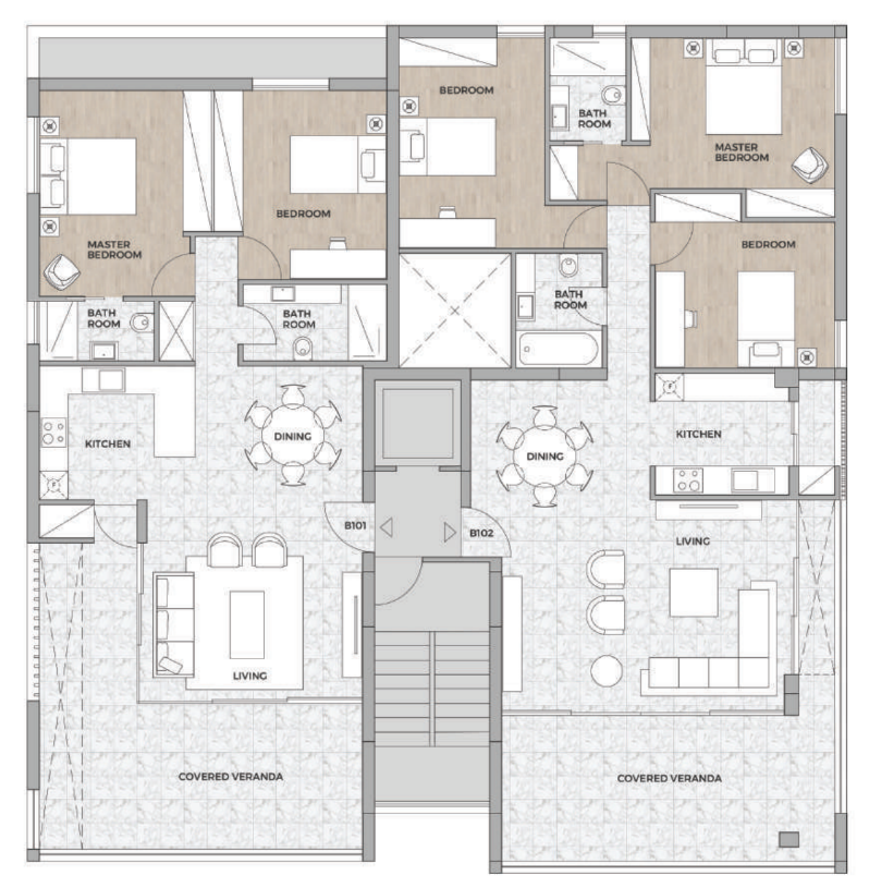 The complex consists of three gated, five-storey residential buildings, each comprising nine apartments. The featured apartment offers three bedrooms, two bathrooms, and a covered veranda.