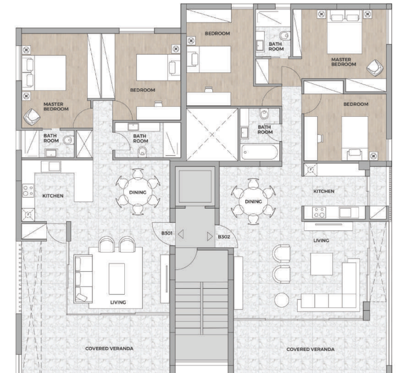 The complex consists of three gated, five-storey residential buildings, each comprising nine apartments. The featured apartment offers three bedrooms, two bathrooms, and a covered veranda.
