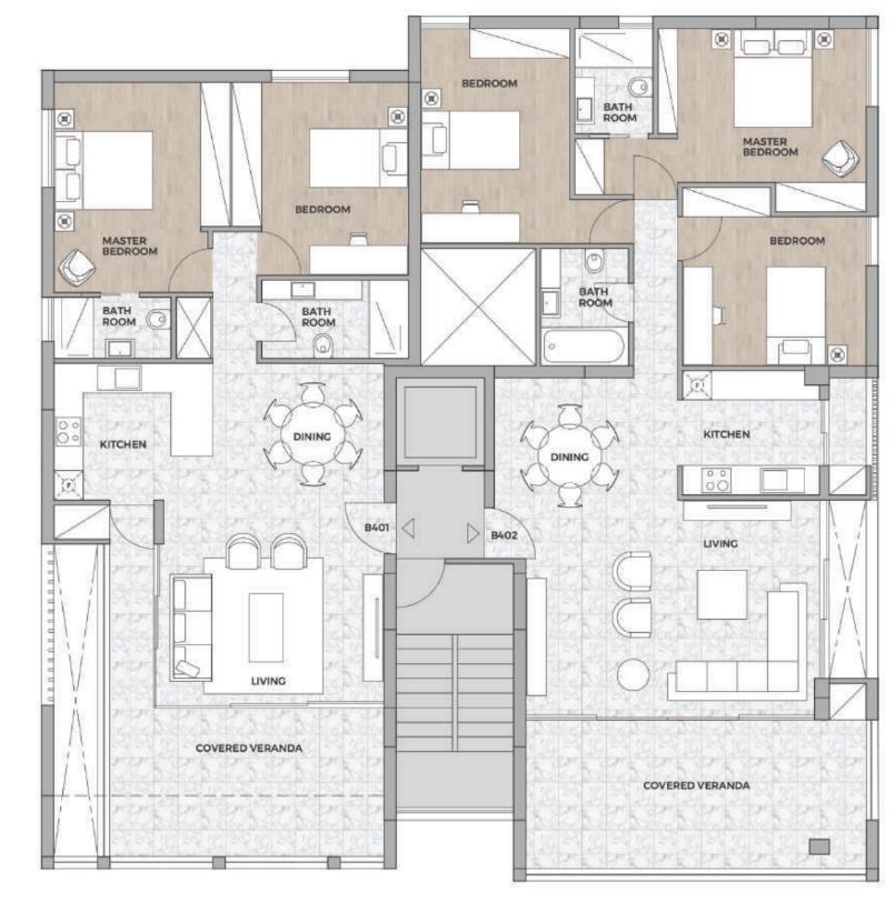 The complex consists of three gated, five-storey residential buildings, each comprising nine apartments. The featured apartment offers three bedrooms, two bathrooms, and a covered veranda.