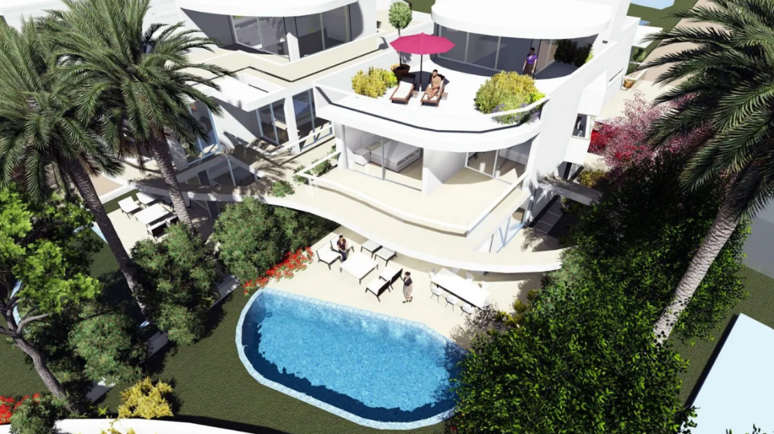 The villa consists of three levels and offers direct sea views. It includes 5 bedrooms, 4 bathrooms, an open-plan living and dining area and a private swimming pool.