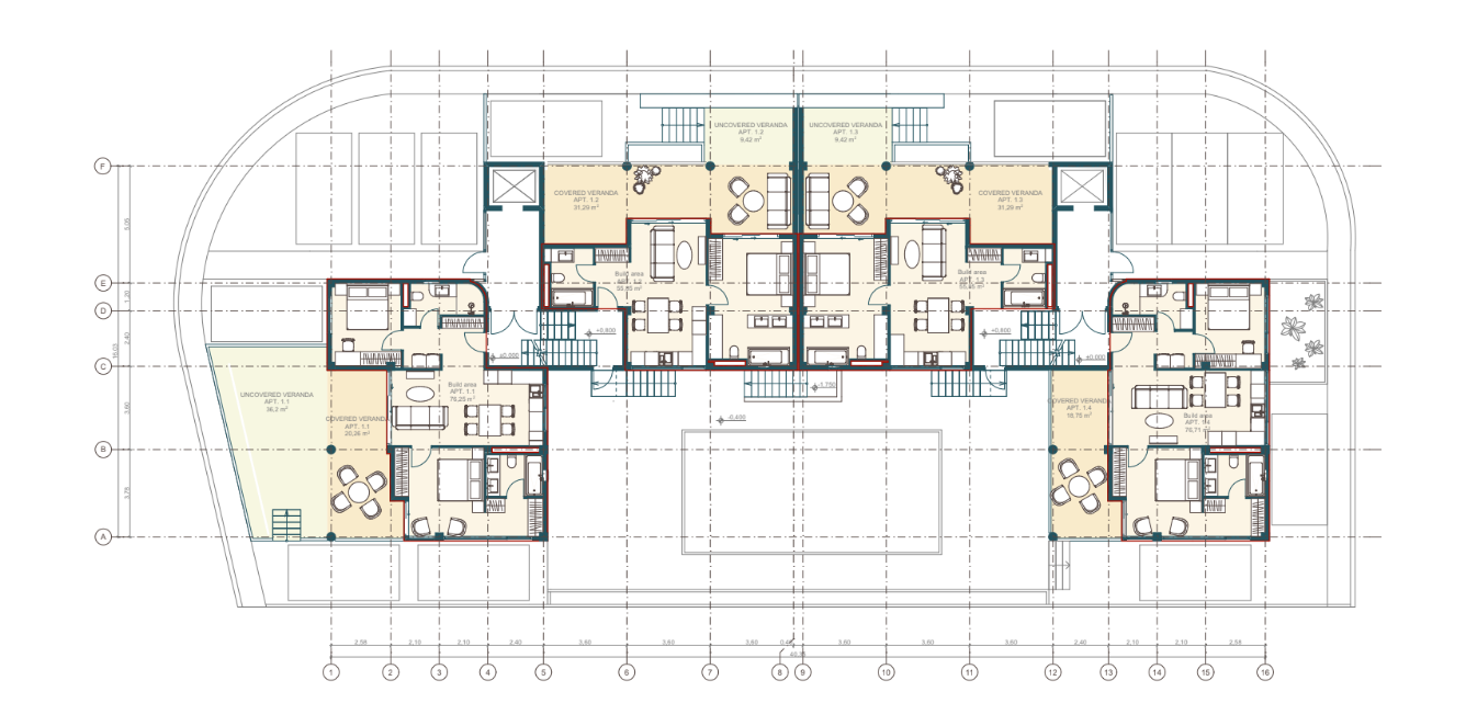 This project is located in the city center of Paphos, close to supermarkets, shops, a private school, and only 700 m from the sea. The complex features a communal swimming pool with showers and green areas.
